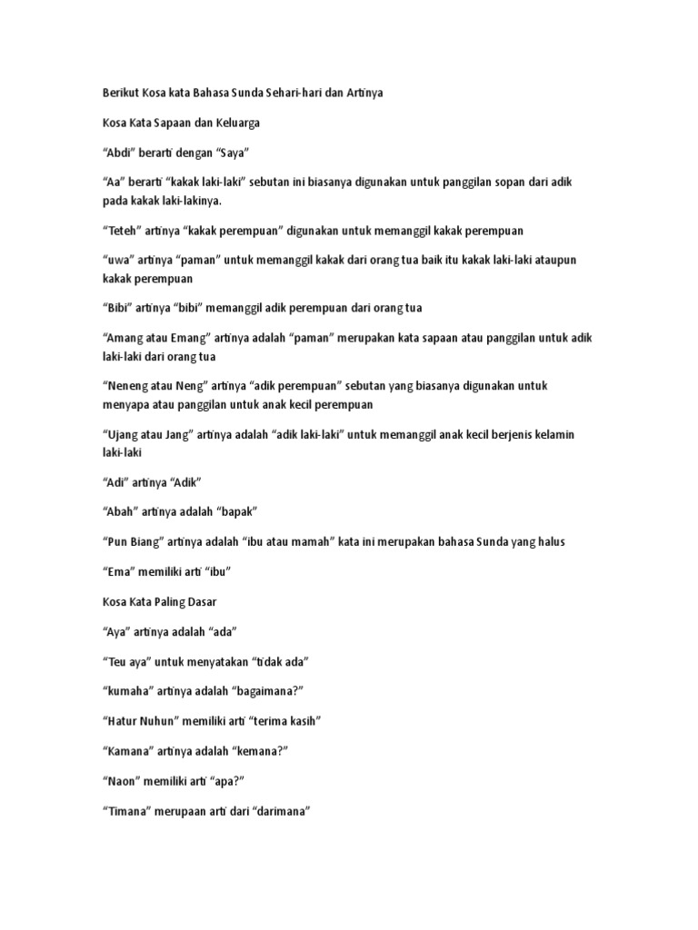 Berikut Kosa Kata Bahasa Sunda Sehari Hari Dan Artinya Pdf
